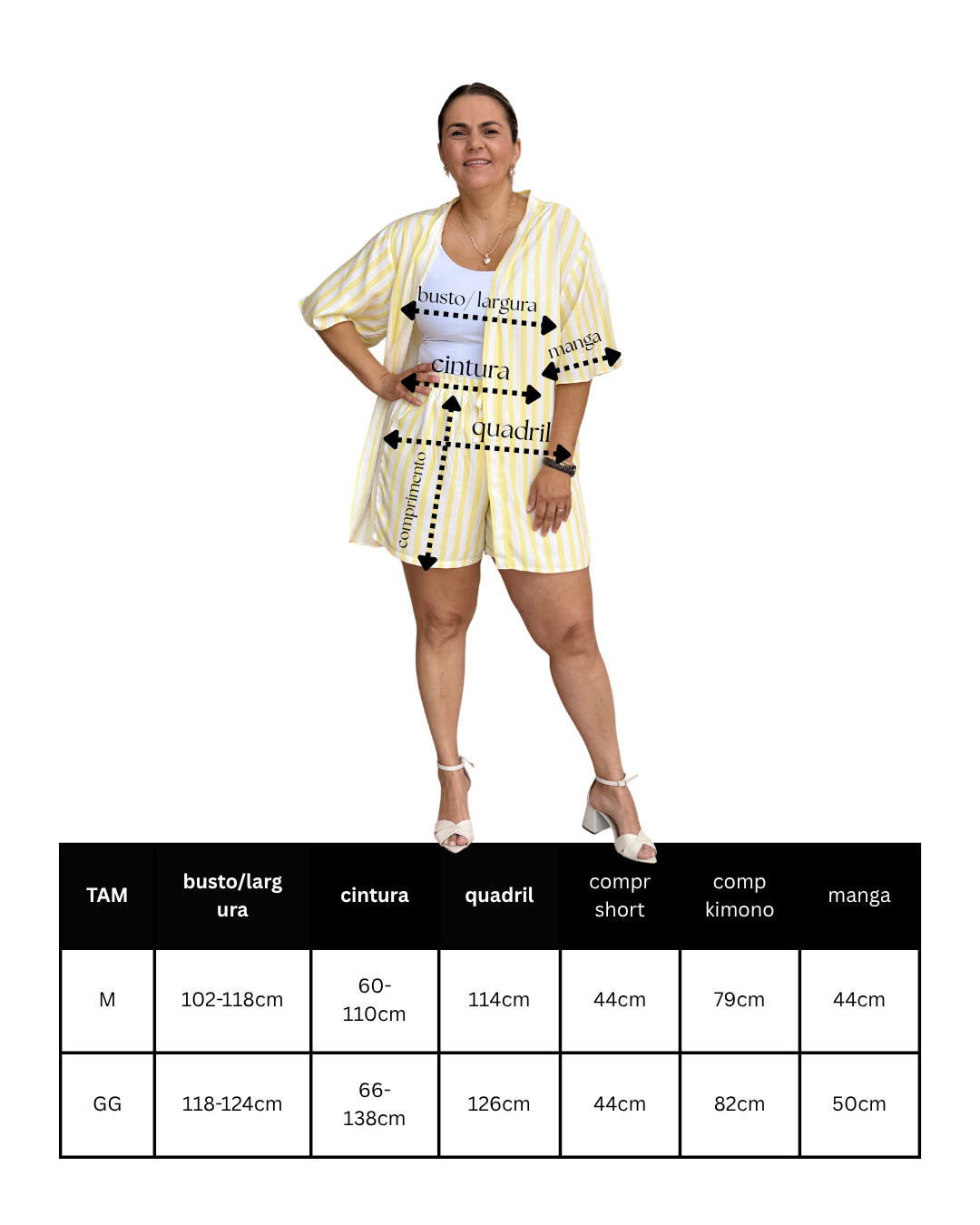 Descubra o Conjunto Kimono Listrado, a combinação perfeita de conforto e estilo para os dias quentes! Confeccionado em viscose leve, o kimono e short proporcionam um caimento solto que valoriza sua liberdade de movimento.